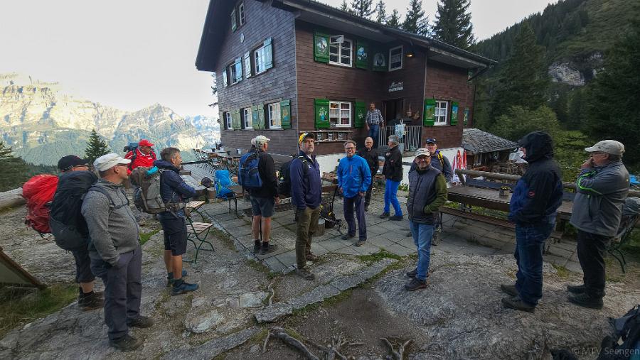 Acht Uhr 54, Schwanden. Top Wetter im Kanton Glarus. 18 wanderlustige Männer warten mit bereits teilweise leichteren Rucksäcken (ein bisschen Wein muss sein) auf die Weiterfahrt mit dem Postauto und Seilbahn nach Mettmen.